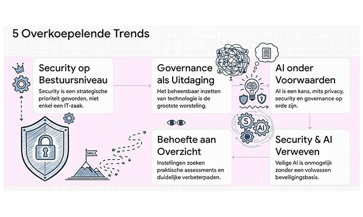 Door alle groepen wordt security gezien als urgent en structureel. Het onderwerp staat nadrukkelijk op de agenda van bestuur en management, mede door wetgeving, het Normenkader IBP en toenemende cyberdreiging. - Governance is de grootste uitdaging